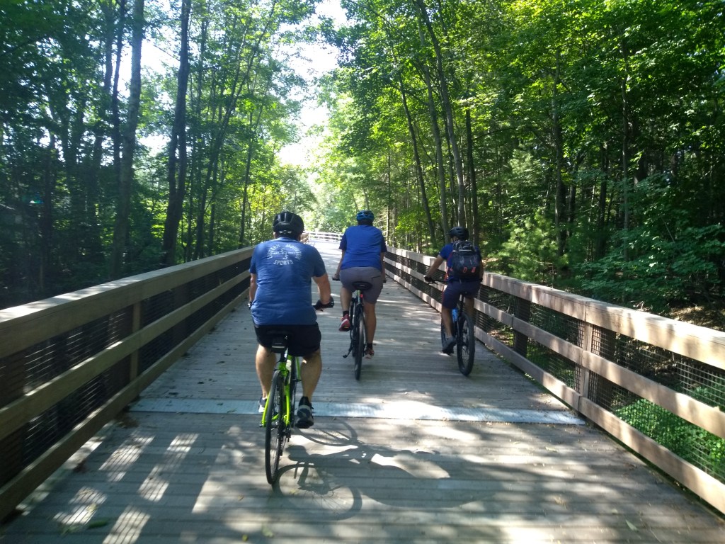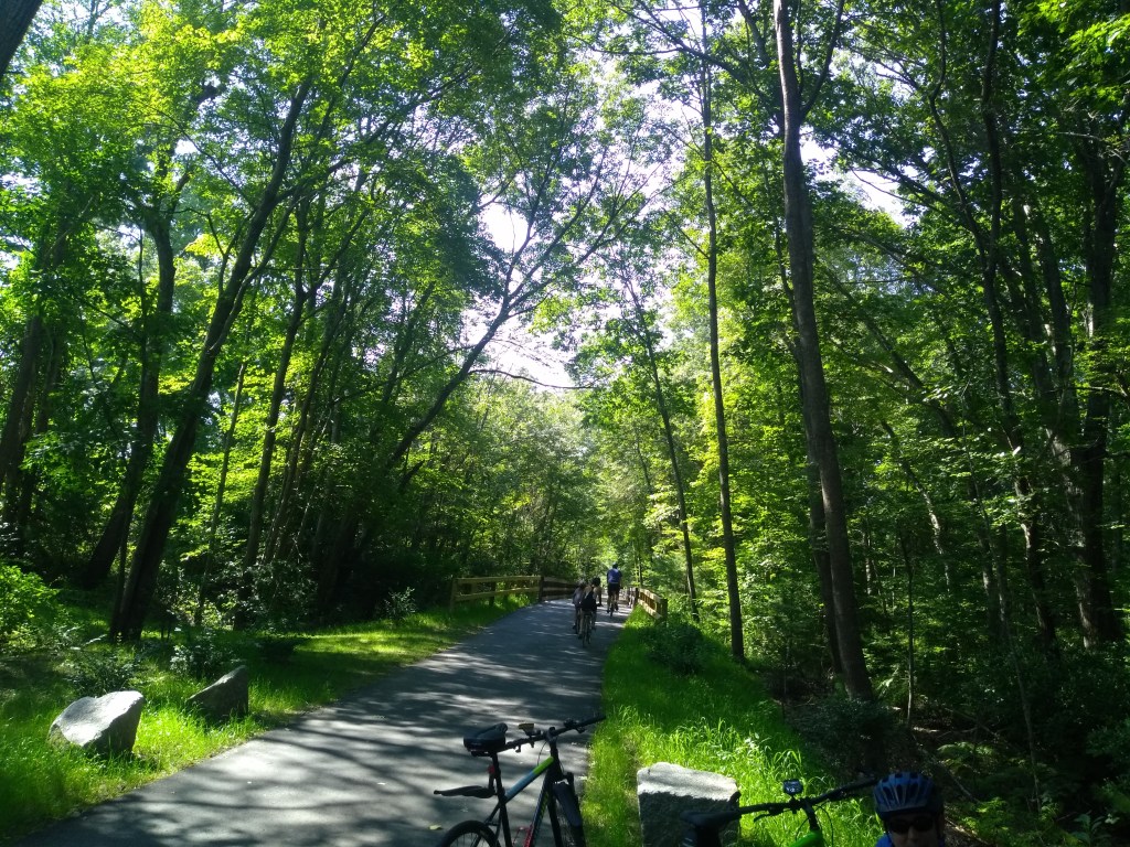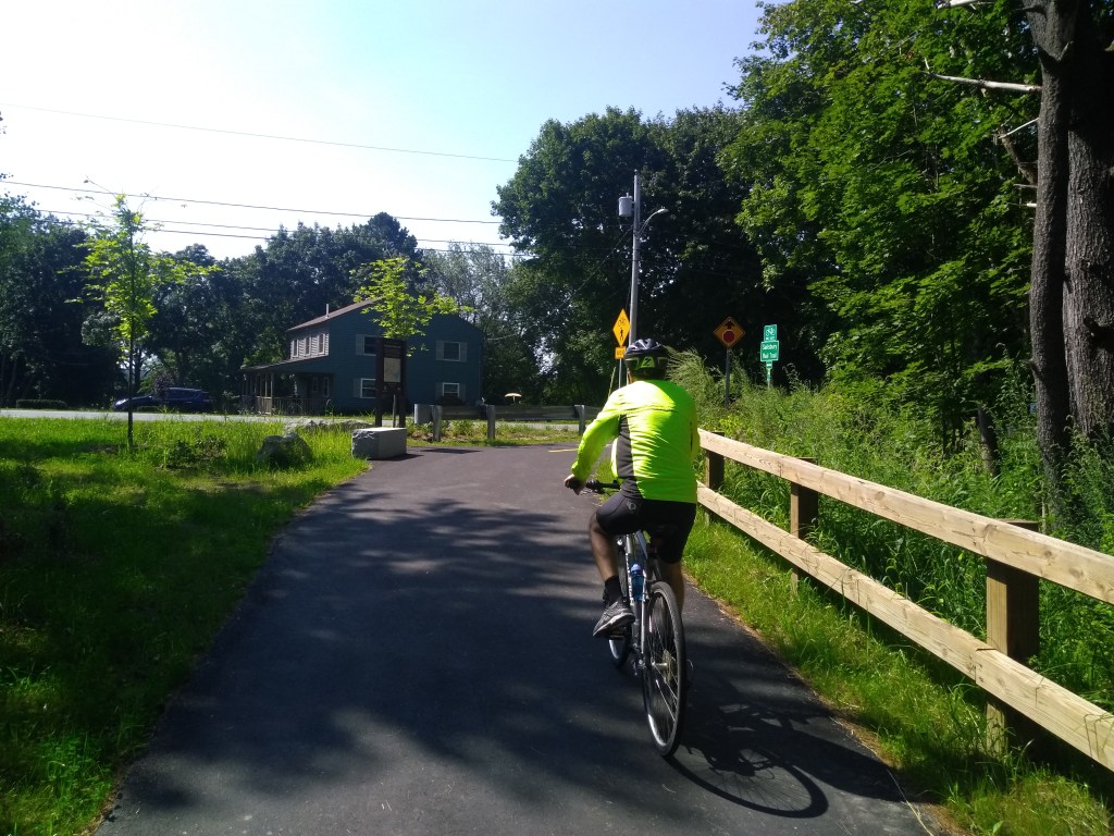 I rode the trail with a few friends a couple of weeks ago. It was quite nice, although we did a round trip south from the Ghost Trail to the river and back, so I still haven’t been on the part north of there. The trail was generally 10-ft. wide and asphalt, as is the older portion of the trail south of Mudnock Rd. Also like the older section, the surroundings were bucolic, including a long, wide boardwalk over a forested wetland and pastoral scenery south of Elm St.