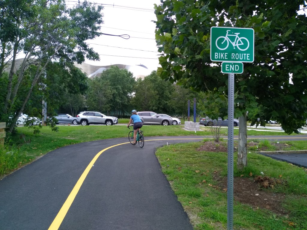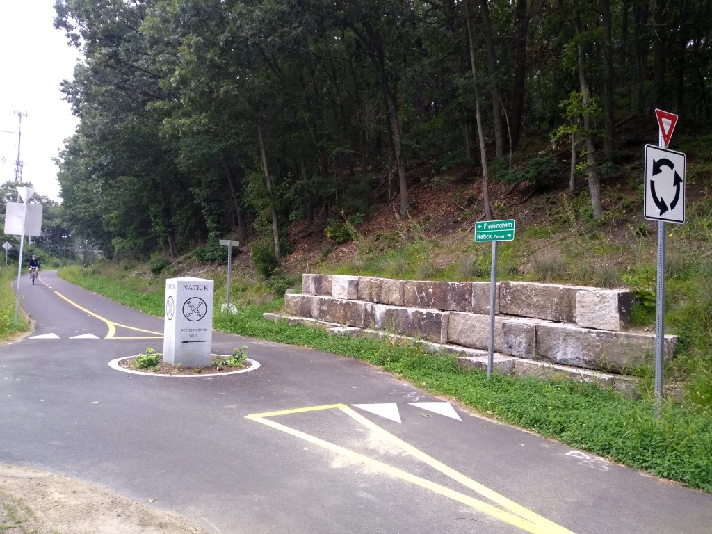 The CRT’s southeastern terminus at Navy Yard Field in Natick CenterThe trail running past the Modera Natick Center apartments/townhousesTrail intersection with Fisher St. (I think). Wide opening with simple splitter island with coneflowers and other low landscaping, no bollards. Wide ladder-style crosswalk markings and detectable warning strip.The trail has a few of these nice waysides with interpretive signage, bike racks, trash/recycling containers, and seating. I believe the large stone blocks were salvaged from the demolition of the old Route 9 railroad bridge abutments.The new bridge over Route 9The Route 9 on/off rampNice trail design along this steeper portion of the old railroad bed, near Lake CochituateTrailside bench getting some useThe milestones provide useful info and add an aesthetic touchInterpretive sign with the loooong history of the CRT’s development. Cheers to the hard work of advocates, elected officials, Town staff and consultants, MassDOT, and others over the years to make this trail a reality.Wayside at a Lake Cochituate overlook (off the left side of the picture)Trail roundabout at the Wonderbread Spur. The excellent thoroughness of wayfinding signage is reminiscent of Dutch paths.Interpretive sign along the Wonderbread Spur. Yes, there really was a bread factory here that made Wonderbread.The Avalon apartments along the Wonderbread SpurThe end of the Wonderbread Spur at Speen St. It’s a short spur but it makes an important connection to destinations. Just across Speen is the Natick Mall, Wegmans, and tons of other shopping opportunities, as well as additional apartments.The new bridge over Route 30This sign is just north of the Route 30 bridge, the area where the extension starts.And one last photo along the older portion of the CRT, showing one of the few shared-use path crossings of I-90 in Eastern Massachusetts.